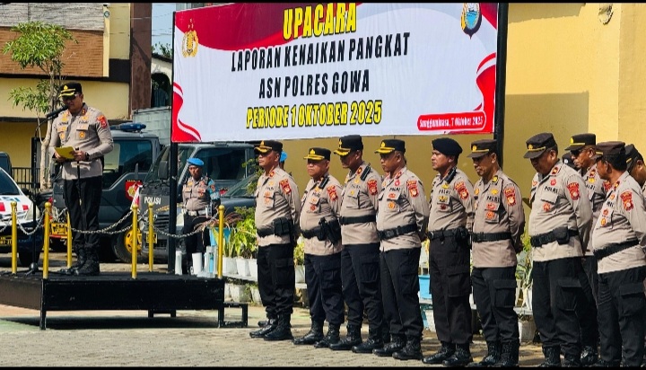 Media – Inspirasi, Gowa Sulsel _ Paolres Gowa menggelar upacara laporan kenaikan pangkat bagi Aparatur Sipil Negara (ASN) bertempat di Lapangan Apel Griya Bhayangkara Polres Gowa, Selasa ( 7/10/2025).